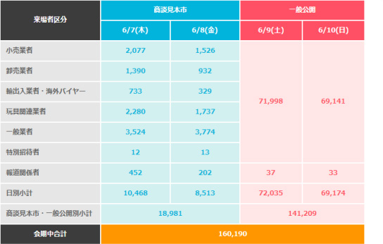 日本東京玩具展,始創(chuàng) 1962 年,由日本玩具協(xié)會(huì)主辦的歷史最悠久,規(guī)模最大的專(zhuān)業(yè)玩具展會(huì),截止 2018 年 6 月,該展已成功舉辦 53 屆,每年一屆,本次展會(huì)共接待了來(lái)自全球 27 個(gè)國(guó)家和地區(qū)的近1000 家參展企業(yè)蒞臨展會(huì),53,856 名專(zhuān)業(yè)買(mǎi)家前來(lái)參觀采購(gòu),來(lái)訪觀眾達(dá) 160,190 次,展出面積50000 平方米,同比去年增長(zhǎng) 11%;其中境外買(mǎi)家2,838 名,增長(zhǎng)21%。